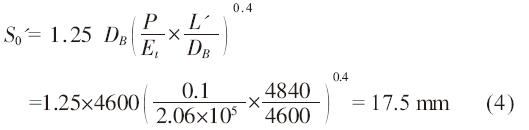 真空室圓筒中部不設(shè)置加強(qiáng)筋時(shí),圓筒的計(jì)算長度為L'=4840mm,代入(2)式可計(jì)算出圓筒計(jì)算壁厚S0':