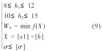 根據(jù)真空室的結(jié)構(gòu)和受力特點(diǎn),采用軸對(duì)稱結(jié)構(gòu)進(jìn)行分析,在容器外壁垂直施加標(biāo)準(zhǔn)大氣壓力。真空室力學(xué)幾何模型如圖2 所示。選用真空室壁厚h1,h2 作為優(yōu)化變量,σ 為優(yōu)化設(shè)計(jì)中結(jié)構(gòu)的等效應(yīng)力強(qiáng)度,其作為一個(gè)約束條件。因此可得真空室壁厚優(yōu)化設(shè)計(jì)的數(shù)學(xué)模型為: