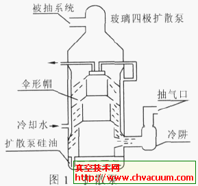 真空分段: ① 粗真空760 ~10 Pa;② 低真空10 ~10- 2 Pa; ③ 中真空10- 2 ~10- 4 Pa; ④ 高真空10-4~10-7Pa;⑤超高真空10- 12~10- 14 Pa;玻璃擴散泵其結構圖1 所示, 擴散泵是高真空泵, 當機械泵的極限真空度不能滿足要求時,通常加擴散泵來獲得高真空。這種泵不能從通常氣壓下開始工作,只能在低于1 Pa 氣壓下才能工作。因此,必須與初級泵串聯使用。