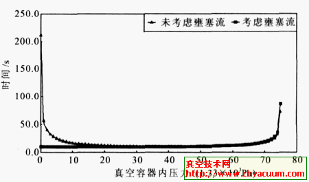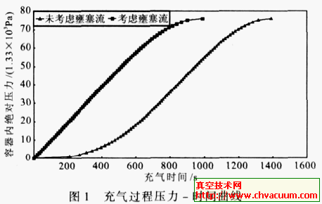由圖2可知,兩種計(jì)算方法在充氣后半部分(真空容器壓力大于臨界壓力)充氣速率幾乎相等。而剛開始充氣時(shí)相差較大。當(dāng)未考慮壅塞流時(shí),剛開始充氣時(shí)壓力每上升1333.22Pa充氣時(shí)間超過200s,隨后逐步縮短到10s左右,這顯然不符合常理。從而證明了本文計(jì)算公式的合理性。