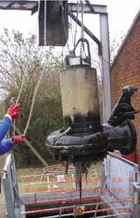 圖1.一臺(tái)泵正被移出以進(jìn)行維護(hù)。泵商一般都會(huì)提供與其泵產(chǎn)品相關(guān)的效率計(jì)算值,但是這些計(jì)算都是基于理想的工況,即介質(zhì)是潔凈的水,不會(huì)有污水帶來的任何一個(gè)麻煩。