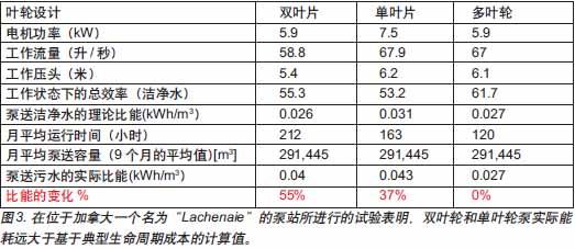 在這個(gè)泵站內(nèi),三類葉輪同時(shí)運(yùn)轉(zhuǎn)9個(gè)月,并將其實(shí)際比能與基于潔凈水測試的曲線進(jìn)行比對(duì)。所謂比能(ES),測量的是泵送單位容量介質(zhì)的能耗(kWh/M3),它是測量系統(tǒng)能耗最為精確的方法。