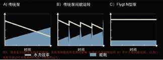 圖4.圖表顯示了3類泵應(yīng)用于污水時(shí),其泵效和能耗所受到的影響 A)單葉片泵持續(xù)運(yùn)轉(zhuǎn) B)單葉片泵間歇運(yùn)轉(zhuǎn),以及C)具有自清潔葉輪機(jī)構(gòu)的Flygt N型泵的運(yùn)轉(zhuǎn)。