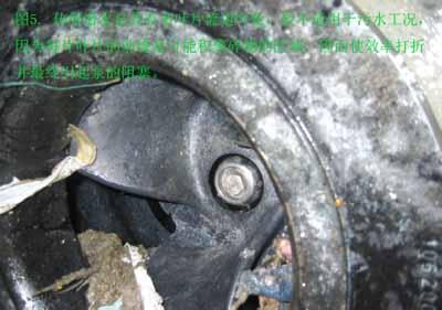 圖5.傳統(tǒng)潛水泵具有多葉片流道葉輪,較不適用于污水工況,因?yàn)槊科~片的前緣是可能積聚碎物的區(qū)域,因而使效率打折并最終引起泵的阻塞。
