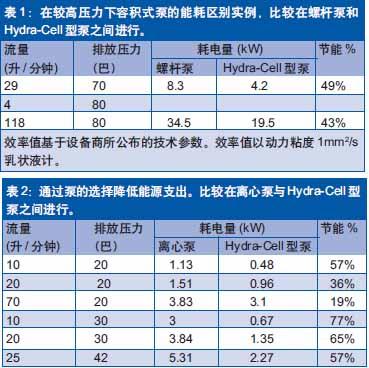 Henneke關注LCC(不僅僅是能耗支出),在他的選擇的對象中忽略了幾種或多或少可能表現出高能效的不類型的容積式工業泵,如活塞/柱塞泵、齒輪泵、雙螺桿泵和單螺桿泵等。不過在高于30~40巴的壓力下,高效泵和其他泵的電力需求差別就非常明顯了(如表1所示)。