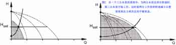 圖2.在一個三臺水泵的系統中,當兩臺水泵達到全轉速時,第三臺水泵開始工作,這時前兩臺工作泵的轉速減小以便使系統壓力再次達到平衡狀態。