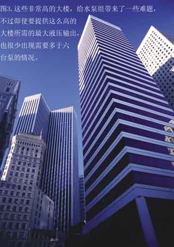 圖3.這些非常高的大樓,給水泵組帶來了一些難題,不過即使要提供這么高的大樓所需的最大液壓輸出,也很少出現需要多余六臺泵的情況。