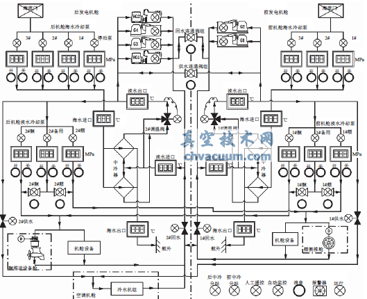 以綜合電力推進的某船為例,在航行和動力定位工況下,共用一套供電系統。推進裝置供電和日常低壓配電,均由中壓供電系統提供。為此在前后發電機艙各設一套中央冷卻分站,組成一個相對獨立,又有一定冗余度的中央冷卻系統。