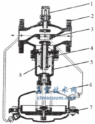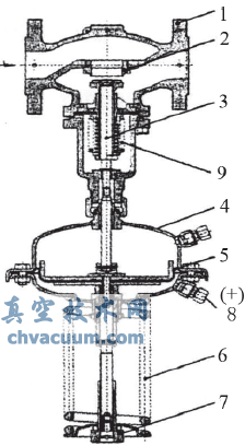 1—閥體;2—閥座;3—閥軸;4—驅動器外殼;5—壓制膜片;6—設定彈簧;7—調定調節;8—接口脈沖管;9—波紋管