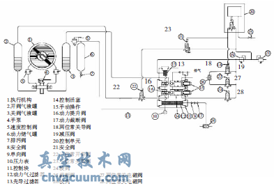 1、電子檢測控制單元動作時氣路走向。控制塊中的高壓氣通過濾網13從控制塊中出來,分成四路,一路進入減壓閥19,一路進入常關閥18,一路進入常關電磁閥27,一路進入常關電磁閥28。從減壓閥19出來的低壓氣一路進入常關閥23,一路進入電子檢測控制單元。當管線內壓力異常時,電子監測控制單元動作,其內部的常關閥導通,使來自減壓閥19的低壓氣進入常關閥23、常關閥18,使常關閥23與常關閥18分別導通。此時,來自減壓閥19的低壓氣可以通過常關閥23進入常開閥22,使常開閥22關閉,從而切斷通往開閥氣液罐的氣路。常關閥18打開后,來自控制塊的高壓動力氣可以通過三通閥26回到控制塊,控制關閥腔上下腔導通,使高壓氣進入關閥氣液罐,完成關閥動作。當常關閥23打開時,氣液聯動閥操作箱上的手柄會落下,起到鎖死作用。這時,如果不將手柄拉上,常開閥22便一直處于關閉狀態,使高壓氣無法通往開閥氣液罐,無法進行開閥操作。