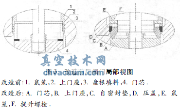 2)上閥座結構根據自密封閥門形式進行改造。將上閥座盤根改造為加設自密封墊子,并且在上閥座上部開具4×M16的底孔用于提升用途。在上閥座與鼠籠之間安裝自密封壓板的同時開具4×Φ17提升螺栓孔,這樣就形成倒掛式的自密封,閥門開啟時上閥芯與上閥座接觸并向上推移,自密封上移并起到密封作用。閥門關閉時由于提升螺栓作用上閥座不會下移,消除了因閥芯往復運動后填料泄露的可能,如圖3所示。同時將門蓋螺栓由原M42(35#鋼)材質提高至42CrMo,在安裝中先利用專用工具將上閥座上提,增大填料的預緊力,然后緊固好門蓋的拉緊螺栓,改善以前只用拉緊螺栓給填料環施加預緊力的情況。