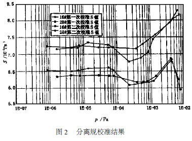 圖2給出了對中科院近代物理所2只只IE514 分離規的校準結果,分離規所配控制單元為IM520 ,2 只分離規的編號分別為16 # 和28 # 。實驗進行了兩次。從校準結果看,2 只分離規的靈敏度S 相差較大,但兩次校準每只分離規靈敏度的重復性較好。壓力低于1 ×10 - 3 Pa ,兩次校準16 #規靈敏度的最大偏差為9 %,28 # 規靈敏度的最大偏差為8 %,均在分離規說明書所給測量精度12 %以內。壓力高于1 ×10 - 3Pa ,由于分離規接近測量上限,2 只分離規的靈敏度偏離線性,16 # 規靈敏度持續增大,而28 # 規靈敏度增大后又下降。總之,在分離規線性測量范圍內,要達到說明書所給的測量精度,必須對每只分離規進行校準。