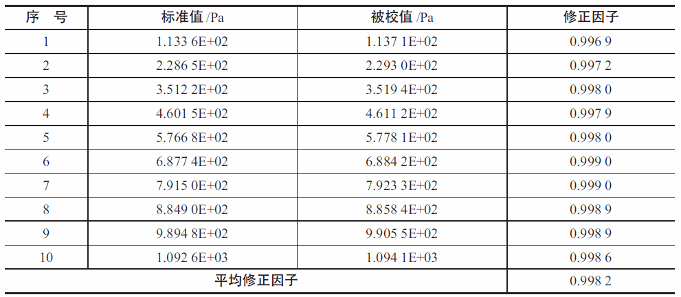 表1 中,用高精密活塞壓力計標準裝置校準電容薄膜真空計的平均修正因子為1.002 1;表2 中,用靜態膨脹法真空標準裝置校準的修正因子為0.998 2。根據式(1)計算二者的偏差為0.39%,小于靜態膨脹法真空標準裝置的擴展不確定度0.80%,該標準裝置技術狀態正常。