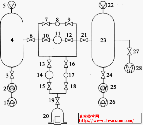 1 ,26 —rotary pump ; 2 ,25 —turbo molecular pump ; 3 ,6 ,7 , 9 ,10 ,12 ,13 , 15 , 16 , 18 , 19 , 21 , 24 , 27 —isolation valve ; 4 —leftcalibration chamber ;5 ,22 —ionization gauge ;8 ,17 —0. 1 L sam-pling chamber ; 11 , 14 —1 L sampling chamber ; 20 —DPG8 ,DHFRS5 ;23 —right calibration chamber ;28 —NEGP