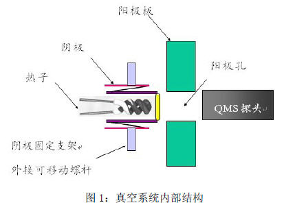 如圖1所示,陰極樣品安裝在支架上。工作中產生的蒸發物會通過陽極板上的小孔進入QMS 的探頭進行分析。陰極和陽極距離大約在300μm。鉭金屬制成的陽極厚度大概在2mm左右。陽極板上小孔的直徑大約為1.5mm。四極質譜計的探頭正對著小孔上方,距離恒定。
