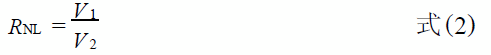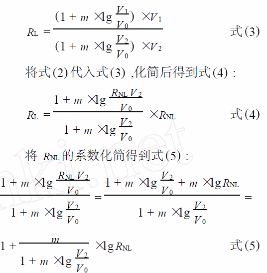 式中, RNL 為未經過非線性修正測得的同位素豐度比值;V 1 為測得的同位素1 離子流的信號強度;V 2 為測得的同位素2 離子流的信號強度。由式(1)和式(2) 得到,經過放大器非線性修正后的同位素豐度比值RL ,示于式(3) :