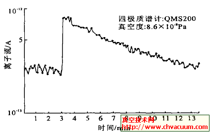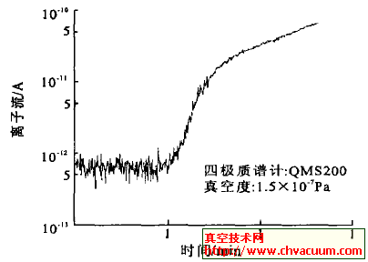 圖3是使用示漏氣體動態(tài)檢漏的譜圖, 檢漏氣體為He。可以看到,當(dāng)噴槍噴到有漏孔的地方時, 四極質(zhì)譜計的He離子流在一個測量周期內(nèi)(設(shè)定測量周期為6s)上升了3倍, 證明此處有漏。當(dāng)發(fā)現(xiàn)漏孔時噴槍即停止噴氣, 漏孔周圍的He濃度沒有繼續(xù)升高。隨著真空容器內(nèi)He被抽走, 其離子流也緩慢下降,10min后達到本底。此前, 我們將一臺標(biāo)稱最小可檢測漏率為5×10-12 Pa·m3/s 的氦質(zhì)譜檢漏儀接在抽氣系統(tǒng)的前級, 對同一漏孔進行檢漏, 但檢漏儀并未指示出有漏。可見, 用四極質(zhì)譜計檢漏非常靈敏和快速, 更適用于極高真空系統(tǒng)。