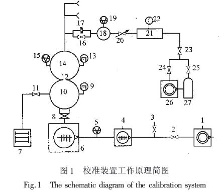 校準(zhǔn)裝置工作原理簡(jiǎn)圖如圖1所示,它主要由供氣系統(tǒng)、進(jìn)樣系統(tǒng)、校準(zhǔn)室和抽氣系統(tǒng)等幾部分組成。供氣系統(tǒng)、進(jìn)樣系統(tǒng)共有相同的3路,圖中只畫出了其中一路。其中1,26為機(jī)械泵;2,23,24為電磁隔斷閥;3為放氣閥;4,6為分子泵;5為中真空規(guī);7為濺射離子泵;8為超高真空插板閥;9,13為超高真空冷規(guī);10為抽氣室;11,16為超高真空角閥;;12,17為限流小孔;14為校準(zhǔn)室;15,19為磁懸浮轉(zhuǎn)子規(guī);18為上游室;20為微調(diào)閥;21為穩(wěn)壓室;22為皮喇尼規(guī);25為減壓閥;27為高壓氣瓶。
