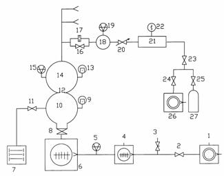 1、26-機械泵;2、23、24-電磁隔斷閥;3-放氣閥;4、6-分子泵;5-中真空規;7-濺射離子泵;8-超高真空插板閥;9、13-超高真空冷規;10-抽氣室;11、16-超高真空角閥;12、17-限流小孔;14-校準室;15、19-磁懸浮轉子規;18-上游室;20-微調閥;21-穩壓室;22-皮喇尼規;25-減壓閥;27-高壓氣瓶。