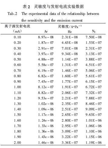 在裝置的校準(zhǔn)室中分別引入了Ar,He,N2,三種氣體成分并形成動(dòng)態(tài)平衡壓力,三種氣體的分壓力經(jīng)測(cè)量分別為2.87×10 -4 Pa、2.55×10-4 Pa調(diào)節(jié)離子源發(fā)射電流數(shù)值,用質(zhì)譜計(jì)測(cè)量出每種氣體的主峰離子流后,根據(jù)式(1)計(jì)算相應(yīng)的靈敏度。