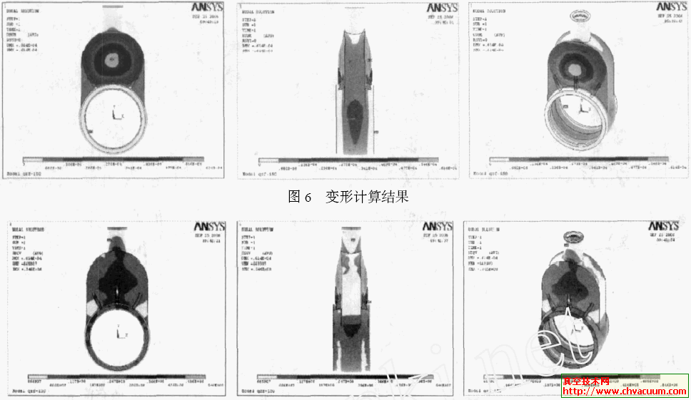 有限元網格單元類型采用8節點塊單元,材料的機械性能為Ex=70GPa,ε=0.133 。變形計算結果見圖6, 應力計算結果見圖7 。