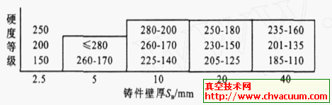 根據(jù)ISO185-1988-12-15《灰鑄鐵分級》附錄C的規(guī)定,灰鑄鐵件的硬度和壁厚之間的關(guān)系值見表3 。