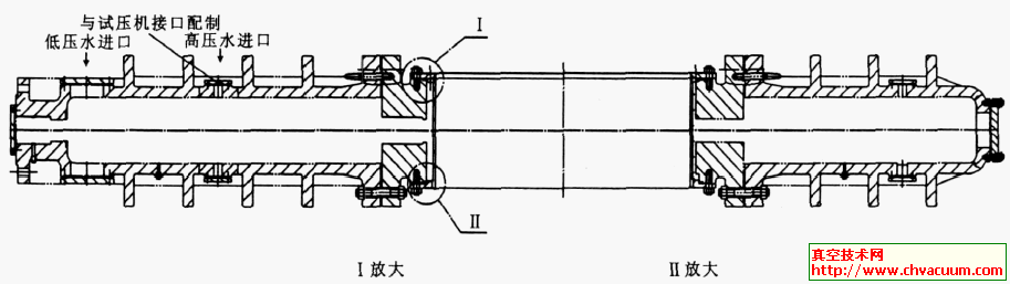 針對試壓裝置存在的剛性不足問題, 對其結(jié)構(gòu)做了改進。將試壓盲板改成試壓筒體(圖3) ,