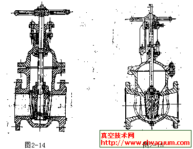 2)楔式閘閥:密封面與垂直中心線成某種角度,即兩個密封面成楔形的閘閥如圖2—13所示。