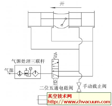 密封面自動補償采用彈簧和壓縮空氣雙重結構(圖3)。閥門關閉時, 壓縮空氣同時進入閥座背面氣室, 推動閥座, 使閥座密封面與球體緊密貼合,較好地保證密封效果。當閥門開啟時, 電磁閥換向(圖4),閥座背面壓縮空氣排空, 閥座卸力, 避免了密封面間的相對磨損, 提高了使用壽命。