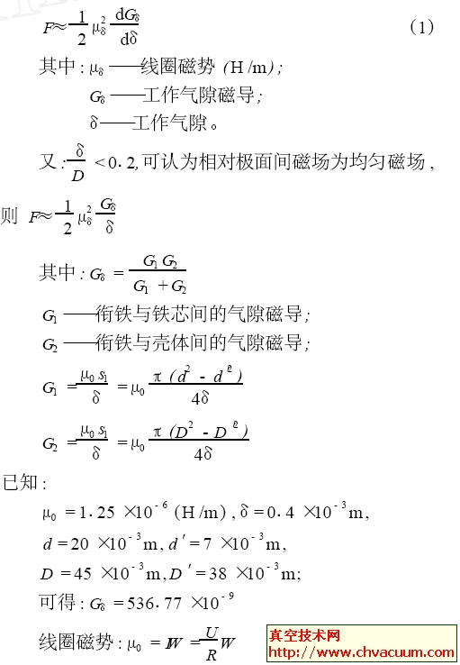 在該磁系統的磁路中,由于工作氣隙較小,故雖然存在漏磁通,但相對于主磁通來說可以忽略,故由《平衡力電磁鐵設計計算及實驗研究》中電磁鐵對銜鐵的吸力F為: