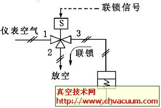 圖2為電磁閥應用在單作用氣開式切斷閥聯鎖時打開及單作用氣關式切斷閥聯鎖時關閉的場合。聯鎖過程:正常狀態下,電磁閥得電,進氣口1 關閉,排氣口2 打開,氣路2 ,3 接通,切斷閥不被供氣,氣開式切斷閥關閉,氣關式切斷閥則為打開;聯鎖狀下,電磁閥失電,電磁閥進氣口1 打開,排氣口2 關閉,氣路1,3 接通,切斷閥供氣,氣開式切斷閥打開,氣關式切斷閥則為關閉。