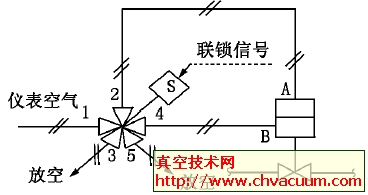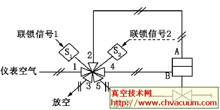 如果聯鎖發生時需要打開切斷閥,則在正常操作時儀表空氣走向為1 —2 ,切斷閥A 氣缸進氣,B氣缸排氣,然后再經電磁閥4 —5 端口放空;聯鎖發生時,儀表空氣走向為1 —4 ,切斷閥B 氣缸進氣,A 氣缸排氣,然后再經電磁閥2 —3 端口放空,切斷閥達到打開的目的。