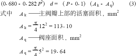 將A k 和A q 代入式( 3 ) 后可得P =0.136MPa (絕壓) , 即表壓為0.036MPa , 從理論上計算該壓力很小, 如果考慮到主閥瓣開啟還要克服摩擦力和開啟時間等因素, 正常情況下常閉腔內壓力會更小, 且建壓時間極短, 可以忽略。