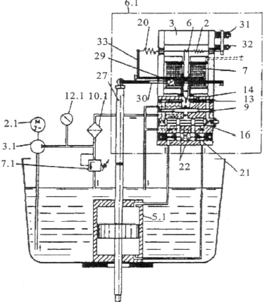 2.1 電機 3.1 油泵 5.1 油缸 6.1 伺服閥(2a. 反饋彈簧 6. 銜鐵 7. 電磁線圈 9. 節流孔 13. 噴嘴 14. 擋板 27.反饋桿 29. 連接裝置)7.1 溢流閥 10.1 過濾器 12.1 壓力表