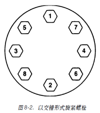 6.確保在閥門的上面和下面留有足夠的空間以便在檢查和維護時容易地拆卸執行機構或閥芯。空間距離通常可以從閥門制造商認定的外形尺寸圖上找到。對于法蘭連接的閥體,確保法蘭面準確地對準以使墊片表面均勻地接觸。在法蘭對中后,輕輕地旋緊螺栓,最后以交錯形式旋緊這些螺栓(圖8-2)。