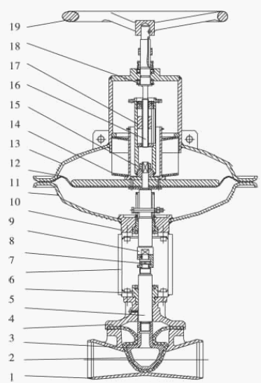 1. 閥體2. 隔膜3. 閥瓣4. 閥蓋5. 閥桿6. 下襯套 7. 支架8. 鞍形夾9. 調(diào)節(jié)螺桿10. 上襯套11. 氣缸 12. 氣缸薄膜13. 氣缸蓋14. 碟形彈簧15. 套筒 16. 手輪桿17. 襯套18. 推力球軸承19. 手輪