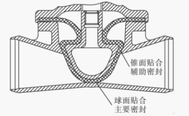 由于直通式隔膜閥的流道平滑,流阻小,可獲得較大的流量,但存在密封困難的弊端。為此,參照瓶塞的結(jié)構(gòu)設(shè)計(jì)球錐形的閥瓣頭部,與隔膜粘貼牢固,以此增加隔膜的強(qiáng)度,隔膜同樣采用球錐形,與閥體上下兩端密封相配,利用橡膠的變形實(shí)現(xiàn)密封(圖2) 。