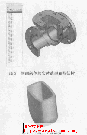 首先將零件分解為具體的基本特征或者元素,然后確定可以使用的特征造型命令,以及要建立怎樣的輪廓,最后確定特征的建立順序。合理的造型順序有利于后期對模型的修改。造型是通過拉伸、旋轉、除料、掃掠和放樣等特征命令或拉伸曲面及縫合曲面等曲面命令建立實體,然后運用布爾“加、差、交”運算,在實體之間合并、挖除和相交成型。最后根據需要添加倒角或圓角等特征。以閘閥(圖1)閥體為例說明三維造型的方法。閥體(圖2)的端法蘭、中法蘭、進水口及出水口部分較為規則,通過拉伸、旋轉拉伸、孔、陣列和鏡像等命令即可實現。中法蘭下方部分外形不是很規則,需要通過曲面功能造型之后,通過縫合和薄壁實現這一部分的三維造型(圖3) 。