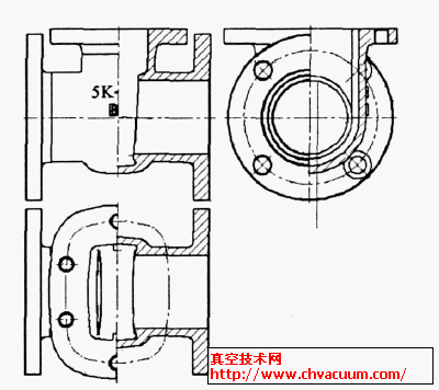Solidedge可以實現由三維實體直接形成二維工程圖的轉化。圖4為由圖2創建的閥體的二維工程圖。在Solidedge的屬性管理器中,可以對零件的名稱、代號和材料等進行填寫。