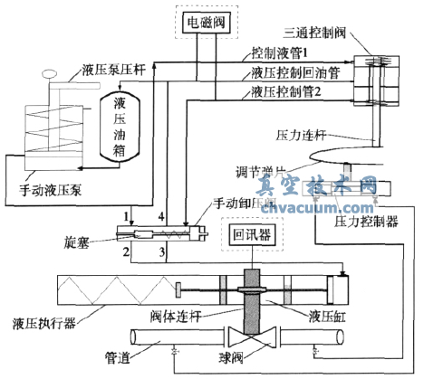 實際使用時,上位機控制電磁閥打開,液壓油經回油管進入液壓油箱,切斷閥關閉,切斷管道液化氣。同時球閥轉動過程中帶動閥桿上端回訊器凸輪轉動,向上位機反饋信號,上位機顯示切斷閥開關狀態。