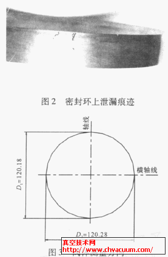 試驗臺架在進行數次常壓升至最大工作壓力和交變壓力、交變溫度(按規定的升降溫度和壓力數率變化)升至最高工作壓力、溫度運行和試驗后,降至常溫常壓保養。再次進行升壓升溫前常溫試壓(P = 9.8MPa)過程時,試驗臺架上的一臺旋啟式止回閥在中法蘭密封副處發生微量外泄漏(以下稱首次泄漏) 。拆解閥蓋、密封環檢查泄漏部位,密封環外圓密封面和閥體中法蘭密封面有介質泄漏后留下的輕微痕跡。密封環外圓密封面的介質泄漏痕跡為外圓密封面銳角處有軸向長×寬約3 ×115mm的毛蟲狀痕跡,其痕跡貫穿密封面(圖2) ,用放大鏡觀察疑似材料的內部缺陷。在閥體中法蘭密封面上有一處介質泄漏的輕微痕跡為水印,與密封環外密封面毛蟲狀痕跡相對應。具體部位在垂直閥體通道軸線方向(以下稱橫軸線方向)的中法蘭密封面的一端,閥體中法蘭密封面其他部位、密封環外密封面其他部位、密封環內密封面和封頭密封面未見泄漏痕跡,各密封面處密封壓痕均勻。