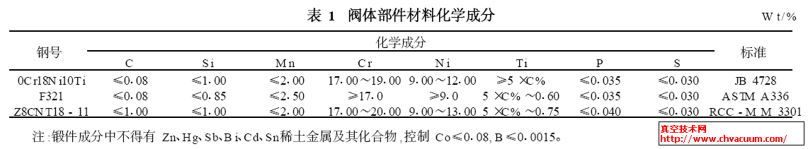 按照產品的工況系統要求,核1級閥門產品據法國標準RCC - M《壓水堆核島機械設備設計建造規則》進行設計制造。閥體和接管均為奧氏體不銹鋼鍛件,其技術要求參照RCC - M M3301,選用等效JB 4728 - 2000中鋼號0Cr18Ni10Ti材料,其化學成分和力學性能對照見表1和表2。其閥體部件是由閥體與兩端接管焊接組成。閥體與接管連接采用全焊透對接焊縫,焊縫厚度70mm,為單面U 形坡口。產品按照RCC - M S3000進行焊接工藝評定,焊縫全部進行射線、超聲波及滲透檢驗,并達到JB4730規定的Ⅰ級焊縫要求。焊縫鐵素體含量為4%~12%。