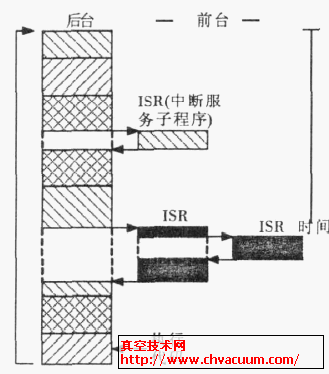目前控制器的MCU所用軟件普遍采用前/后臺工作方式(圖2) 。系統應用程序是一個無限的循環。循環中調用相應的函數完成相應操作,這部分是后臺行為。中斷服務程序處理異步事件,這部分是前臺行為。一般對實時性要求高的操作都是通過中斷服務來保證的。因為中斷服務提供的信息一直要等到后臺程序運行到該處時才能得到處理,所以任務的響應時間取決于整個程序循環的執行時間。