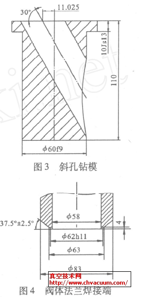 閥體中腔內孔與右端通道有一與中腔夾角30且與外形平行的斜孔(圖2) , 該孔需在閥體與法蘭組焊前經機械加工形成, 這一加工尺寸精度及位置精度采用常用的機械加工方法很難達到要求。為達到這一加工精度, 需閥體中腔粗加工并提高中腔內孔尺寸精度, 并以此孔做定位基準采用專用的斜孔鉆模完成斜孔的粗加工及精加工, 才能達到設計圖樣要求。