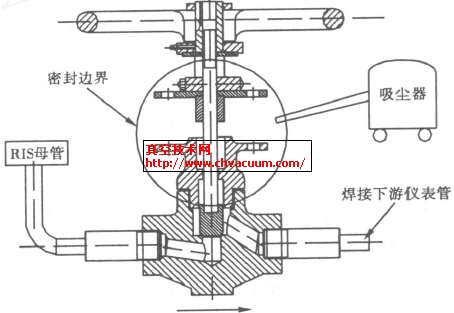 為使滲漏的速率由1滴/4s延長至1滴/10s或液體向下流動時從管內壁已經焊接處向下流, 以保證2mm 的焊縫處無滲漏,必須對滲漏的液體施加干擾力。根據閥門的結構, 通過流動的氣體對滲漏液體進行干擾。經過分析和試驗, 采取了用吸塵器從填料函吸氣法。