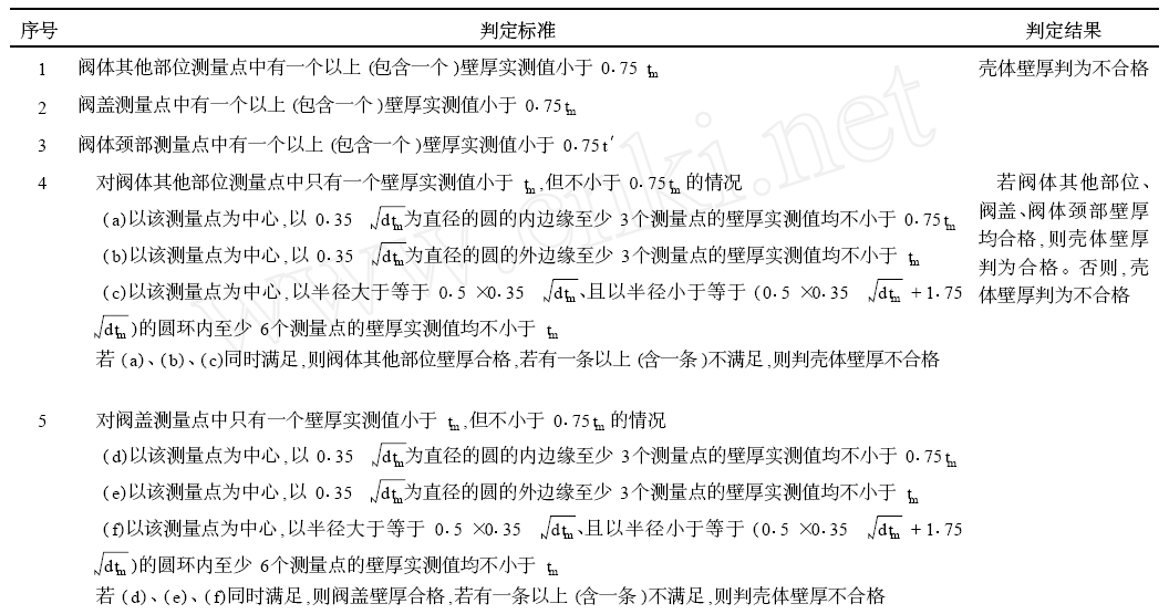 表1 閥門(mén)局部區(qū)域壁厚實(shí)測(cè)值小于殼體最小壁厚時(shí)的壁厚是否合格的判定