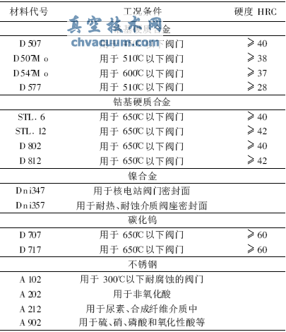 金屬密封表面硬度高且有合適的硬度差。可通過(guò)表面硬化來(lái)提高硬度,增強(qiáng)耐磨性能。金屬密封材料主要有鉻基硬質(zhì)合金、鈷基硬質(zhì)合金、鎳合金、碳化鎢、不銹鋼等(表1)。