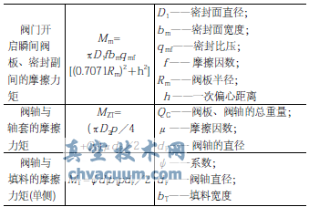 偏心金屬硬密封蝶閥的啟閉力矩包括二次偏心力矩、閥門開啟瞬間閥板、密封副間的摩擦力矩、閥軸與軸套的摩擦力矩、閥軸與填料的摩擦力矩(見下表)。