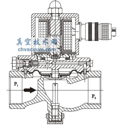 先導式二位三通電磁閥(圖2)同樣由先導閥組及主閥兩大部分組成。主閥的進口端有工藝通道使介質與先導閥相通。通過電磁線圈的通電與斷電,使先導閥控制主閥完成下面的功能:進口與工作口接通或關閉;工作口與排空口接通或關閉。